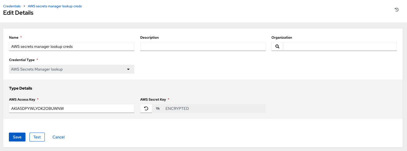 To test the lookup, create another credential that uses the HashiCorp Vault lookup. The example below shows the attributes for a machine credential configured to look up HashiCorp Vault secret credentials: